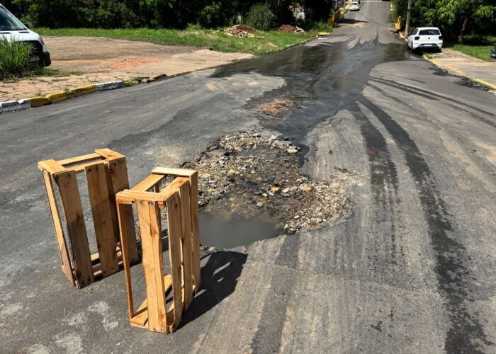 A situação também apresenta risco à segurança. Para alertar motoristas e evitar acidentes, a sinalização do buraco foi improvisada pelos próprios moradores, que utilizaram caixotes de madeira no meio da via.